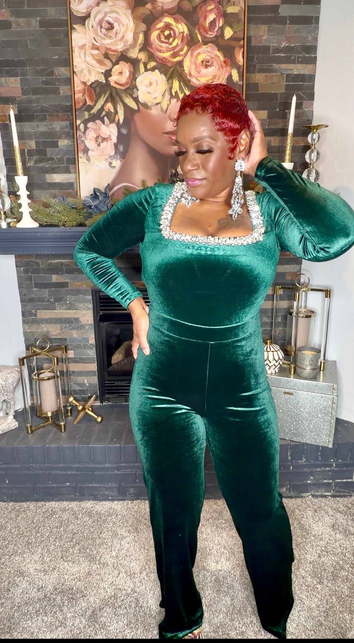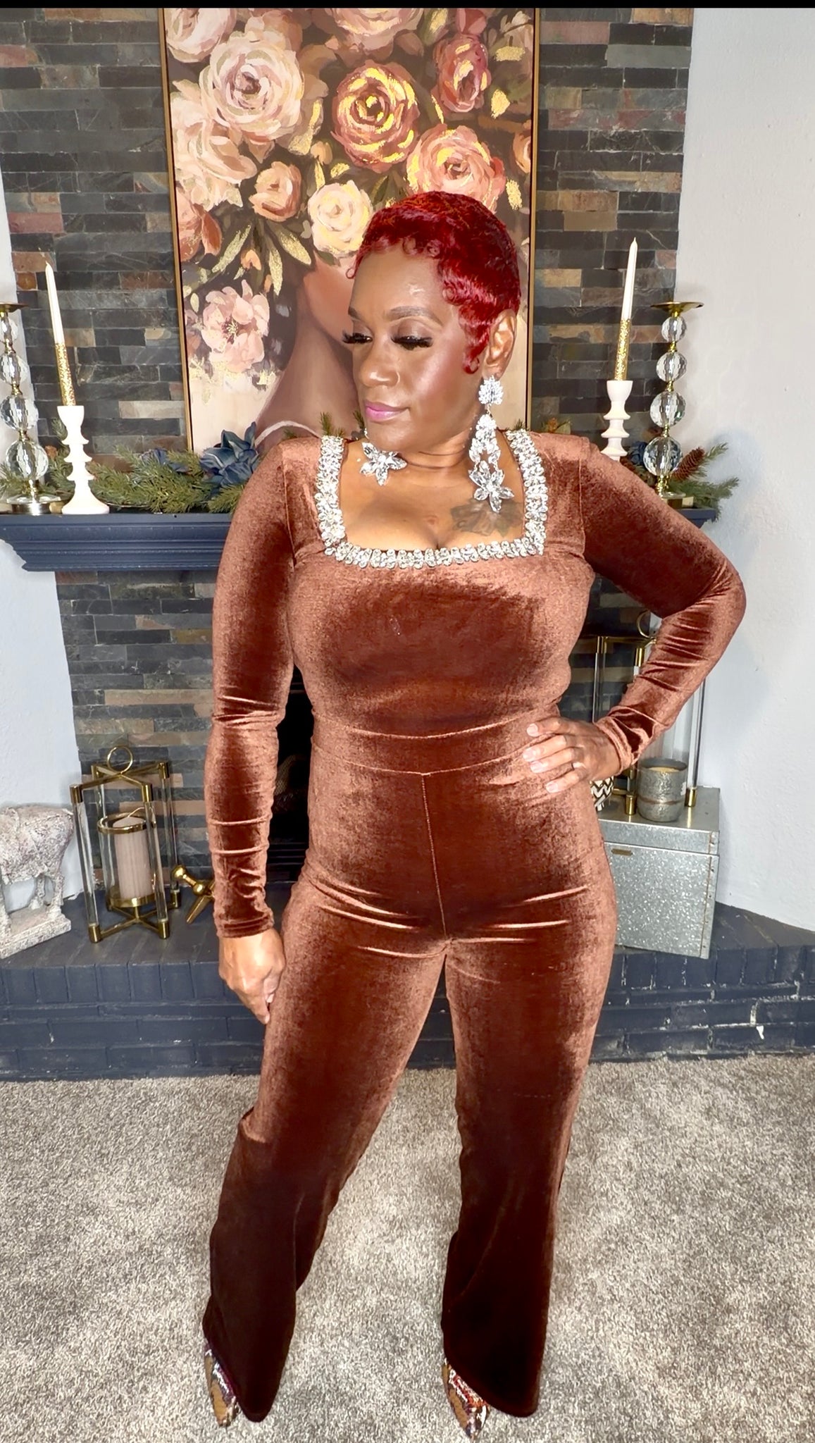 Velvet one piece jumpsuit with jeweled neckline